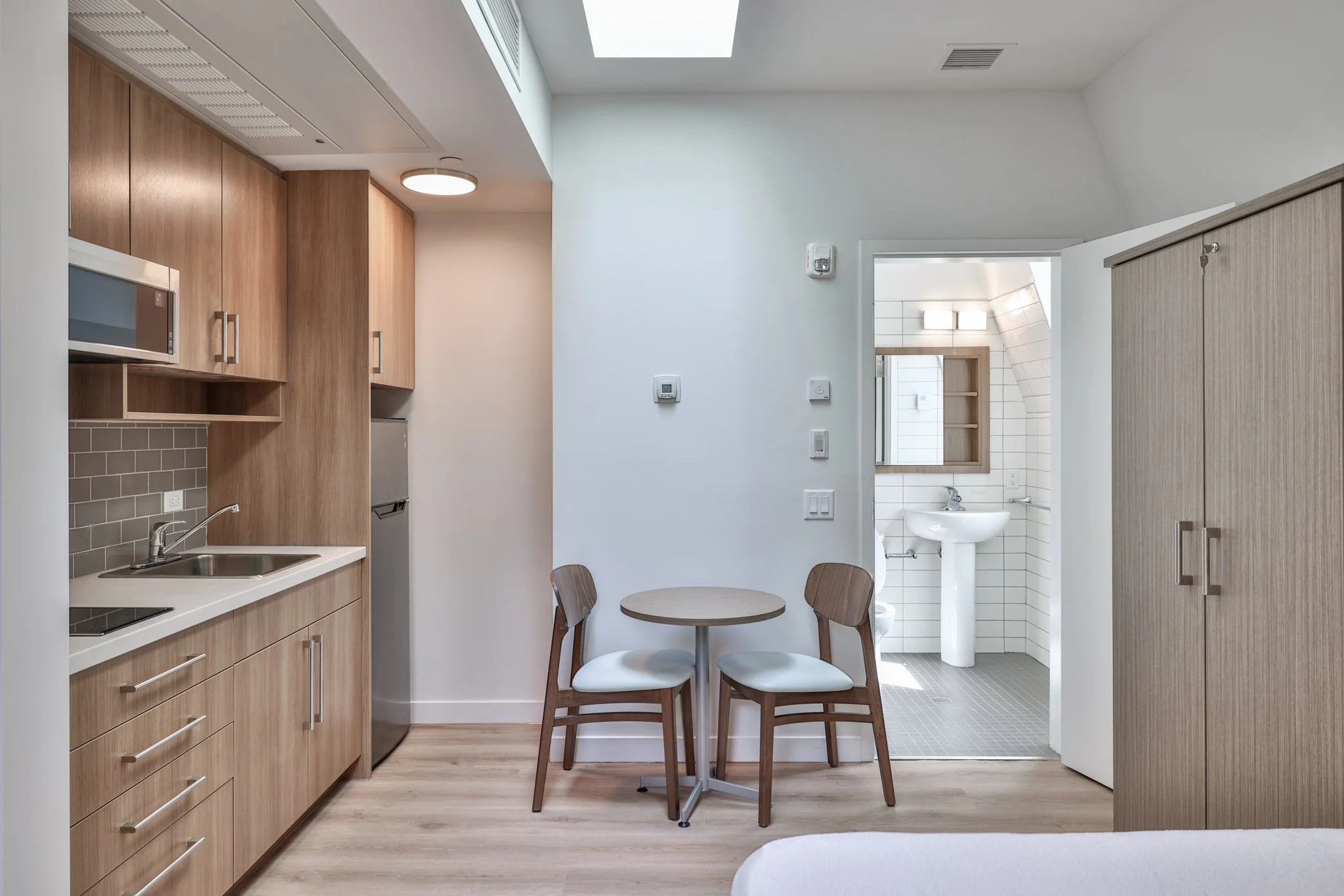This project connects four former semi-detached heritage buildings in Toronto’s Cabbagetown neighbourhood into a single residential building providing a total of 35 self-contained affordable housing units, made up of 31 studio and four one-bedroom apartments, 20% of the total being fully accessible units.