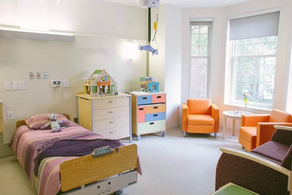 The design creates a domestic scale that feels homelike and playful to children and their families, while providing sophisticated support infrastructure, such as piped oxygen and medical air, ceiling lifts and an