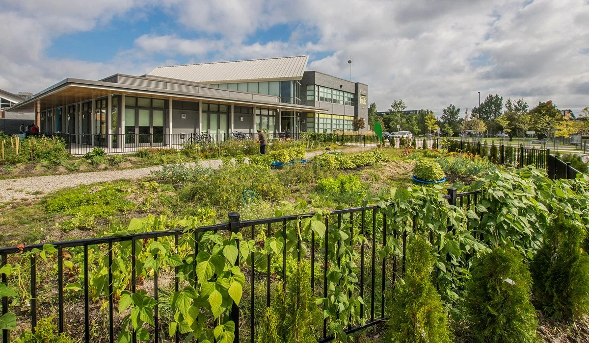 The inclusion of community gardens promotes urban food security, and an associated teaching kitchen centres the importance of proper nutrition to healthy lifestyles.